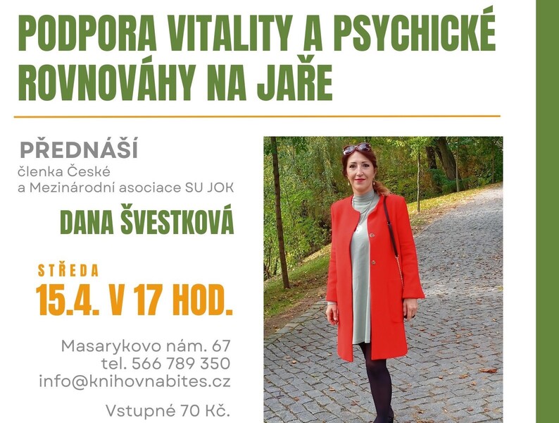 PODPORA VITALITY A PSYCHICKÉ ROVNOVÁHY NA JAŘE 8.4.2026 Přednáška s Danou Švestkovou, členkou České a Mezinárodní asociace SU JOK se koná ve středu 15.4.2026 od 17.00 hod. Masarykovo náměstí 67.