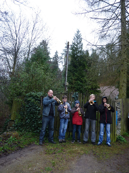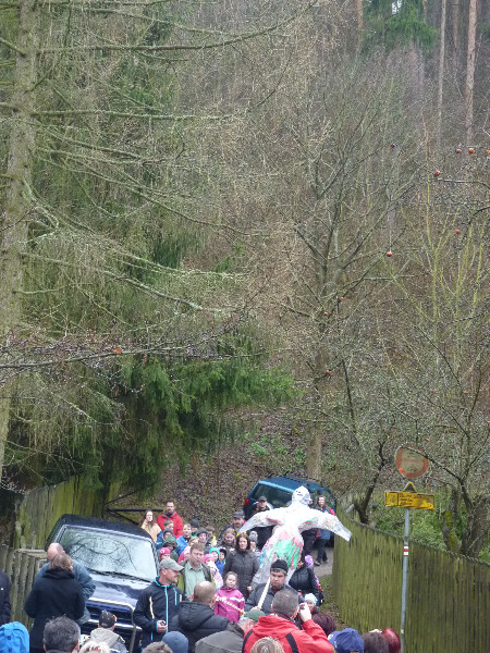 O půl dvanácté přišly zpívající děti ze Základní školy Domašov přivítat jaro společně s „Morénou", která, aby nezmokla, byla v pláštěnce, což bylo pro přítomné nezvyklé. Děti recitovaly básničky, zpívaly písničky a následně byla Moréna - symbol končící zimy zapálena a poté vhozena do potoka.