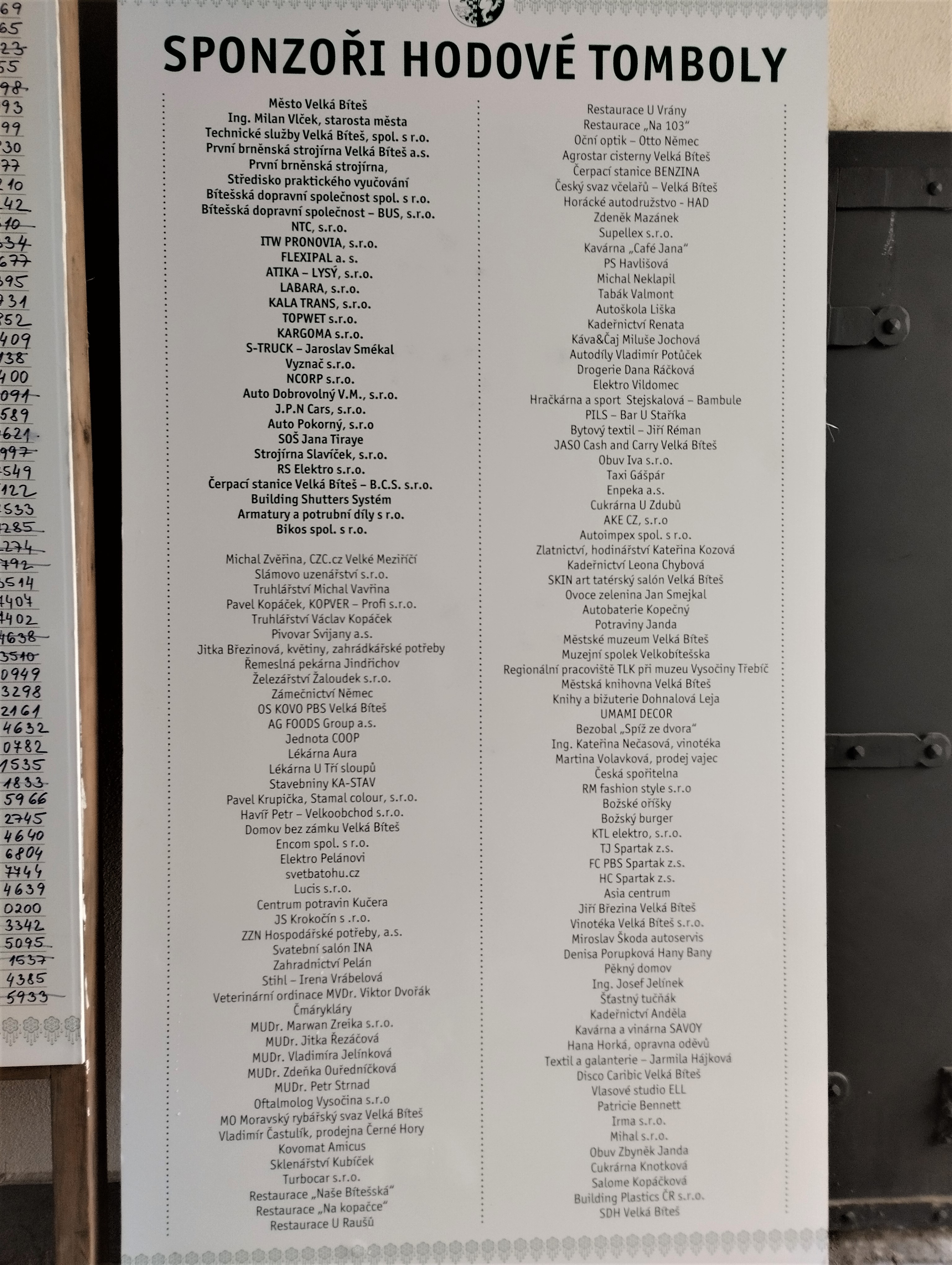 Též bychom chtěli moc poděkovat dalším 120 sponzorům, kteří přispěli ať už finančními, nebo věcnými dary do bohaté hodové tomboly.