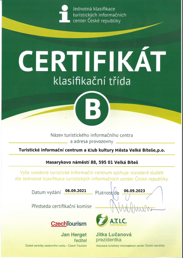Turistické informační centrum Velká Bíteš je nositelem certifikace v klasifikační třídě B.