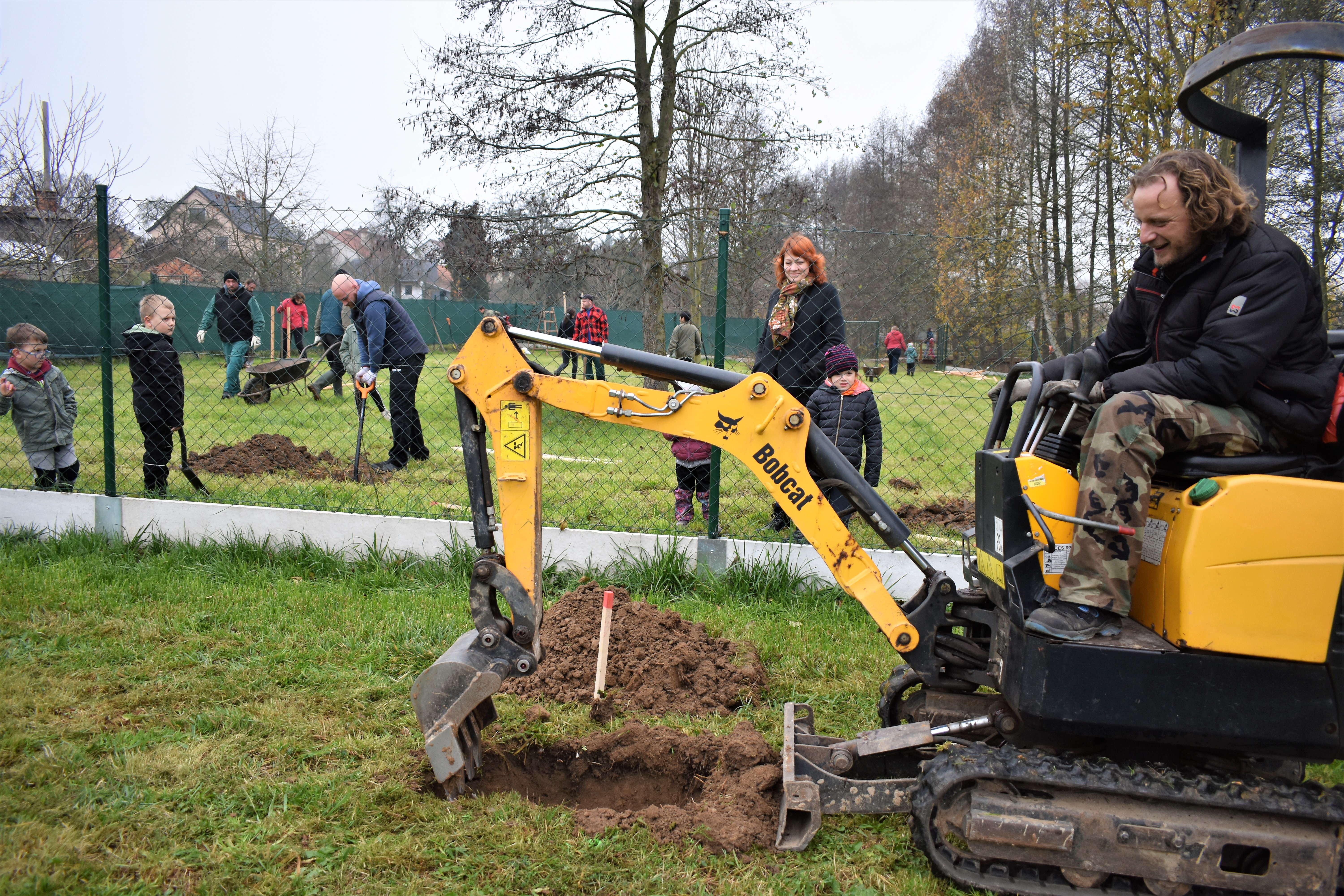 Z pohledu pozorovatele s foťákem mohu říci, že práce šla všem zúčastněným pěkně od ruky. Muži většinou kopali jámy, do kterých potom usazovali stromky s kořenovým balem. To také není úplně snadná práce, protože záleží na velikosti balu a hlína v jámě se musí průběžně udusávat. Kromě toho se ke stromku zatloukají dřevěné kůly, ke kterým se kmen přivazuje. Nakonec se stromy hodně prolily vodou z nedalekého potoka. Spolupracovali všichni - malí i velcí, ředitelka školy i paní starostka. Kdo nevysazoval, ten pomáhal s hrabáním listí nebo jinou potřebnou prací na školním hřišti. Ke svačině a také zahřátí připravil kolektiv školky teplý čaj i sladkou buchtičku, což přišlo v podzimních počasí vhod.
