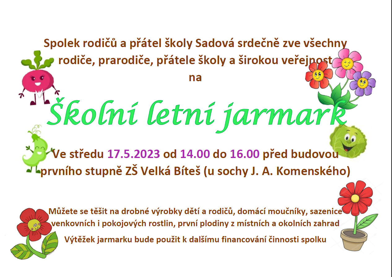 Součástí Dne otevřených dveří bude také tradiční PRODEJNÍ JARMARK SRPŠ, který bude probíhat od 14 - 16 hod před budovou prvního stupně (u sochy J. A. Komenského) a kde si budete moci zakoupit drobné výrobky dětí nebo třeba sazenice rostlin.