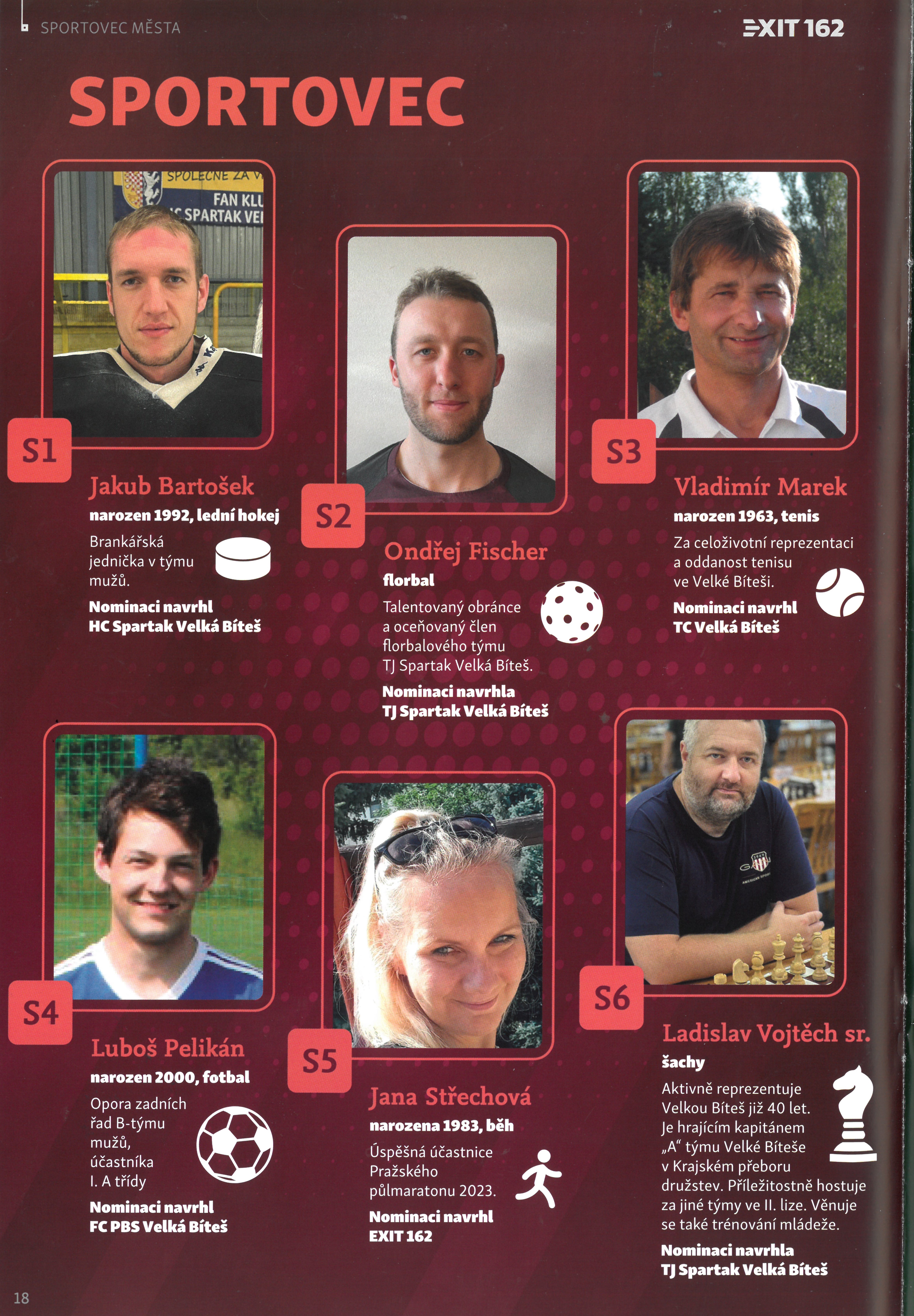 Výsledky ankety budou zveřejněny v březnovém vydání Exitu 162. Osobní předání cen a gratulace proběhne na SPORTOVNÍM PLESE v sobotu 17. února 2024 v 19 hodin.