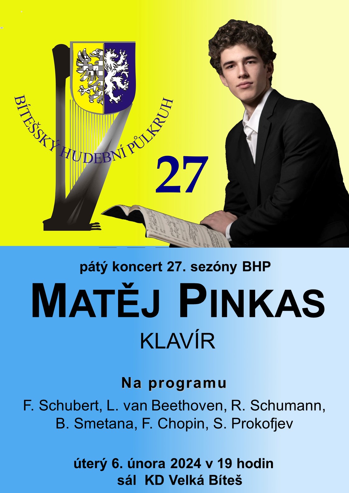 Pro koncert ve Velké Bíteši si Matěj zvolil velmi zajímavý a náročný repertoár. Zazní skladby F. Schuberta, R. Schumanna, můžeme se těšit na Beethovenovu Valdštejnskou sonátu a uslyšíme autory, které renomovaní pianisté ve svém recitálu nemohou vynechat – B. Smetanu, S. Prokofjeva a F. Chopina.