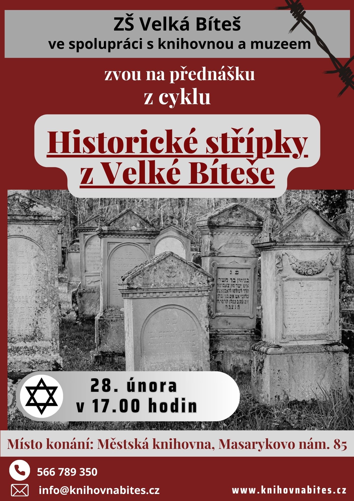 Přednáška z cyklu Historické střípky z Velké Bíteše, bude tématicky zaměřena na Židovskou menšinu žijící před válkou v našem městě. O rodině Fuchsových přijde do knihovny říci pár slov ředitel muzea Ivo Kříž, žáci základní školy přednesou několik příspěvků na téma Kamenů zmizelých, židovských symbolů a židovského stravování, seznámí přítomné rovněž s problematikou Holokaustu. Nebude chybět ani ochutnávka tradičního židovského pokrmu.