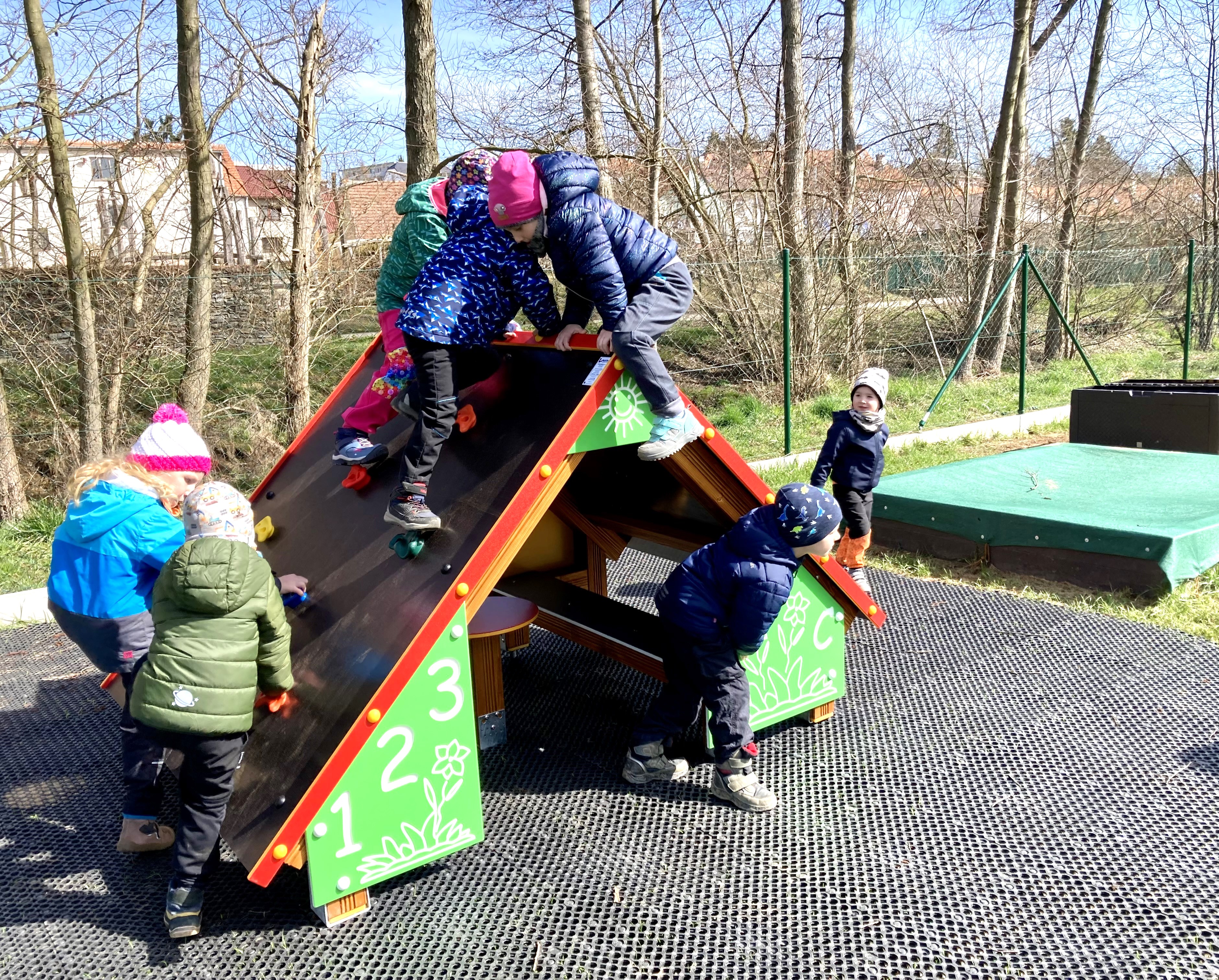Na zahradě za potokem jsme také nově instalovali lezecký domeček. S jeho ukotvením nám pomohl pan Navrátil ve spolupráci s naším údržbářem panem Maškem. Velice touto cestou děkujeme za pomoc! Poděkování také patří technických službám, které nám zajistily kontejner a panu Pavlíčkovi za vybagrování balvanů, které našly využití v jiné části města Bíteše.