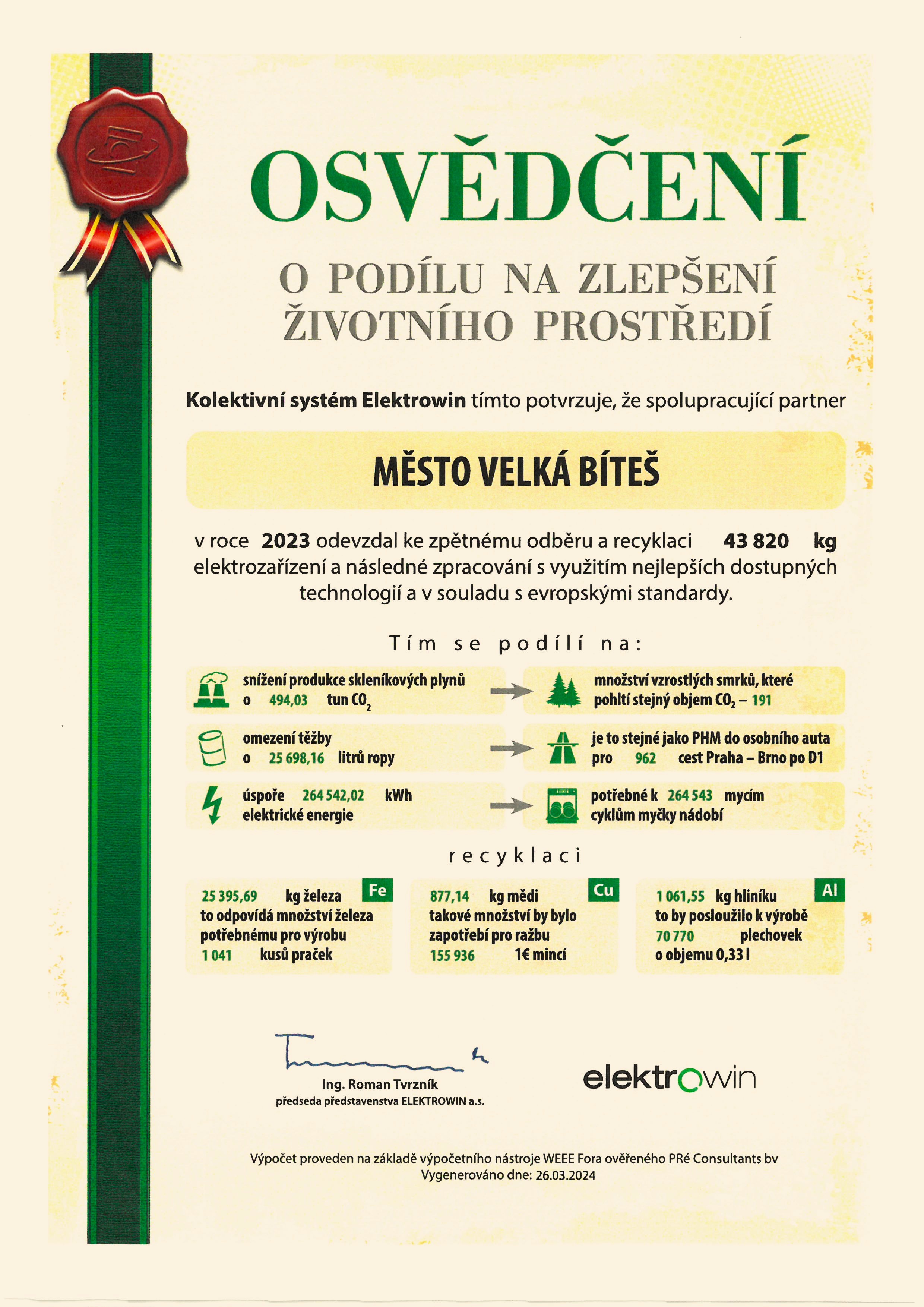 Díky obyvatelům se naše Město Velká Bíteš může za rok 2023 pochlubit výsledky sběru vysloužilého elektrozařízení předaného ke zpětnému odběru společnosti Elektrowin o celkové hmotnosti 43,82 t. Každý obyvatel tak odevzdal průměrně 8,17 kg spotřebičů.