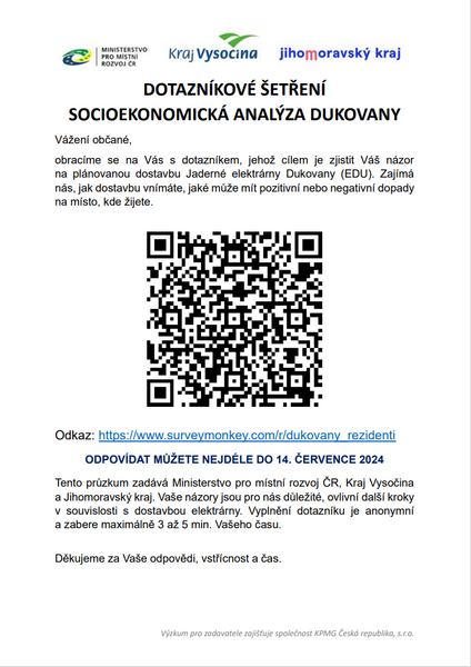 DOTAZNÍKOVÉ ŠETŘENÍ SOCIOEKONOMICKÁ ANALÝZA DUKOVANY 12.6.2024 Cílem tohoto dotazníku je zjistit Váš názor na plánovanou dostavbu Jaderné elektrárny Dukovany. odkaz na dotazník