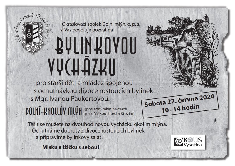 BYLINKOVÁ VYCHÁZKA V sobotu 22. června 2024 od 10.00 - 14.00 hodin vás Okrašlovací spolek Dolní mlýn o. p. s., zve na BYLINKOVOU VYCHÁZKU.