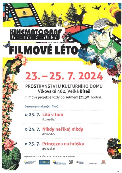 FILMOVÉ LÉTO 24.6.2024 Zveme vás na FILMOVÉ LÉTO, které se koná ve dnech od 23.6. - 25.6.2024 na prostranství u KULTURNÍHO DOMU, Vlkovská 482, Velká Bíteš.