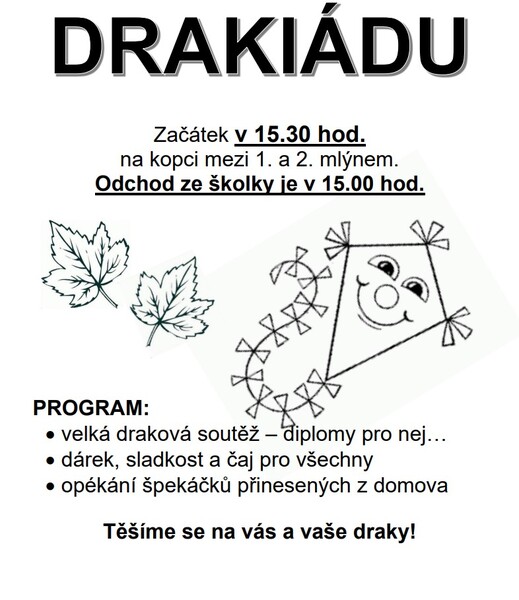 DRAKIÁDA 10.9.2024 Mateřská škola U Stadionu pořádá pro děti z našeho města a okolí ve čtvrtek 10. října 2024 DRAKIÁDU.