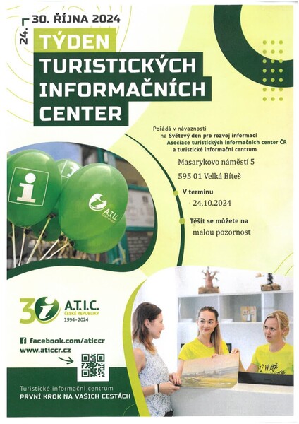Ve dnech od 24. - 30.10.2024 se koná týden turistických informačních center. V našem turistickém centru jsme si k této příležitosti vyhradili 24. říjen 2024 a těšit se při návštěvě našeho Informačního centra můžete i na malou pozornost.