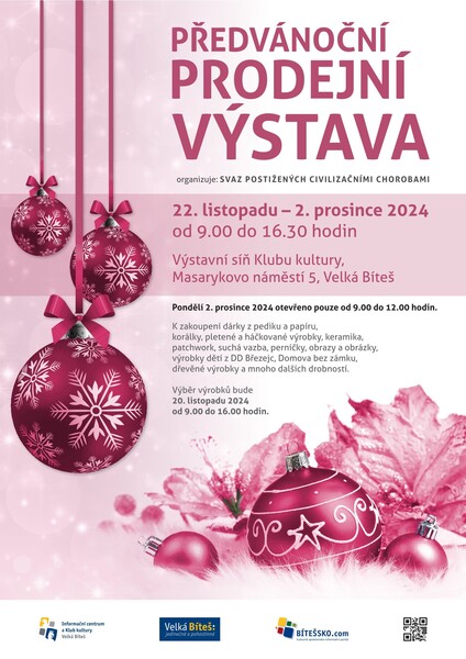 PŘEDVÁNOČNÍ PRODEJNÍ VÝSTAVA 7.10.2024 Předvánoční prodejní výstava od 22. listopadu - 2. prosince 2024 ve výstavní síni Klubu kultury, Masarykovo nám. 5, Velká Bíteš