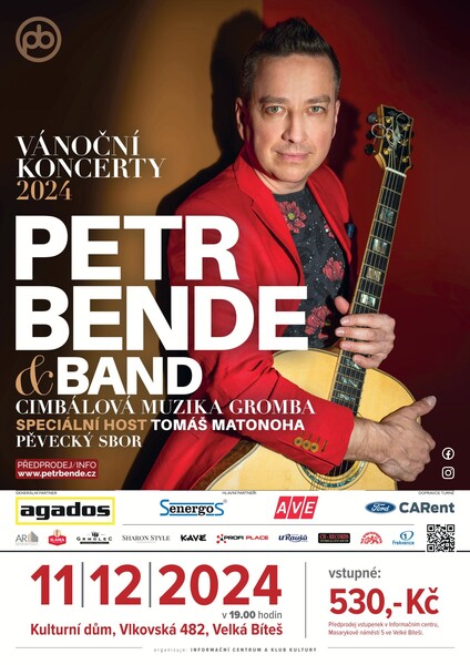 11.12.2024 se můžeme těšit na VÁNOČNÍ KONCERT PETRA BENDEHO, který proběhne v Kulturním domě, Vlkovská 482. Předprodej vstupenek v Informačním centru na Masarykově náměstí 5, Velká Bíteš.