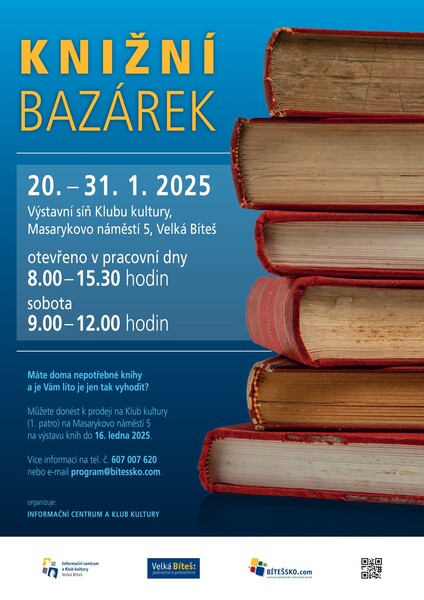 Máte doma nepotřebné knihy a je vám líto je jen tak vyhodit? Můžete donést k prodeji na Klub kultury (1. patro) na Masarykově náměstí 5 na výstavu knih do 16. ledna. Více informací na tel. č. 607 007 620 nebo e-mail