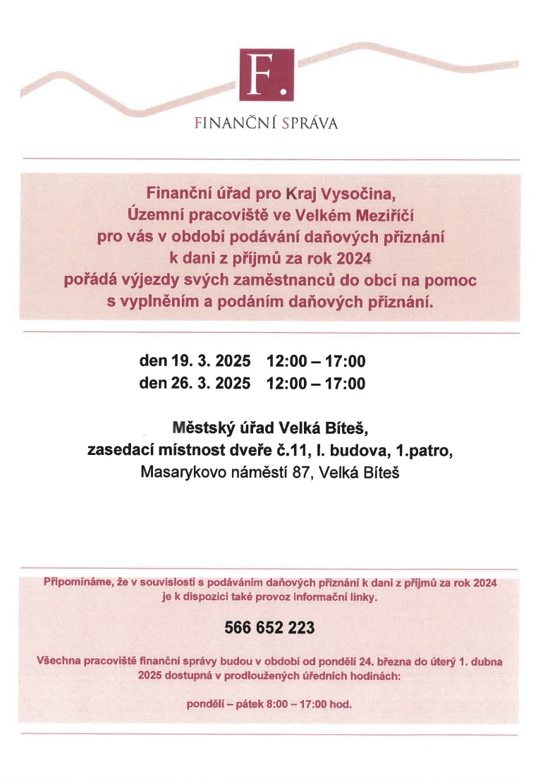 Finanční úřad pro Kraj Vysočina, Územní pracoviště ve Velkém Meziříčí pořádá výjezdy zaměstnanců do obcí na pomoc s vyplněním a podáním daňových přiznání.