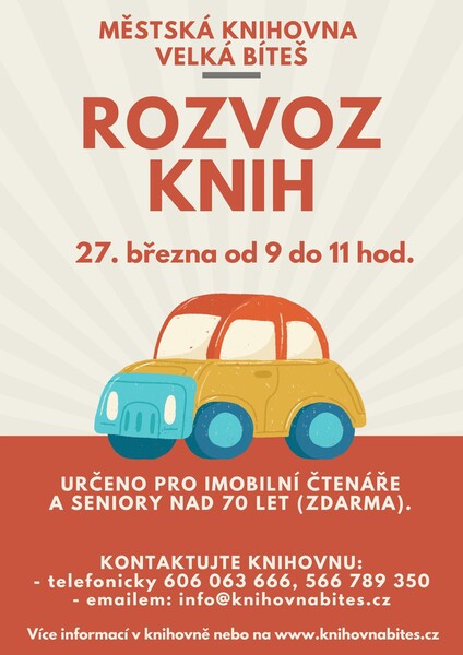 27.3.2025 proběhne rozvoz knih a to od 9.00 - 11.00 hod., je určeno pro imobilní čtenáře a seniory nad 70 let. Zájemci kontaktují knihovnu na tel.: 606 063 666, 566 789 350 nebo e-mailem: