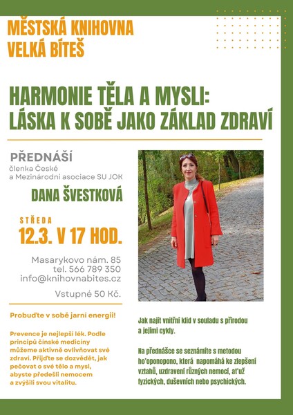 PŘEDNÁŠKA - HARMONIE TĚLA A MYSLI 21.2.2025 Městská knihovna Velká Bíteš pořádá přednášku Dany Švestkové na téma HARMONIE TĚLA A MYSLI, která se koná 12.3.2025 v 17.00 hod.