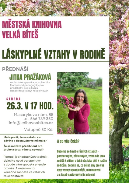 PŘEDNÁŠKA - LÁSKYPLNÉ VZTAHY V RODINĚ 28.2.2025 26.3.2025 v 17.00 hod. se v městské knihovně uskuteční přednáška Jitky Pražákové na téma LÁSKYPLNÉ VZTAHY V RODINĚ.