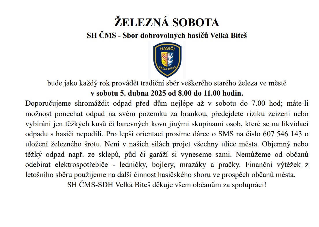 Sbor dobrovolných hasičů Velká Bíteš bude provádět tradiční sběr veškerého starého železa ve městě v sobotu 5. dubna 2025 od 8 do 11 hodin.