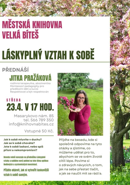 LÁSKYPLNÝ VZTAH K SOBĚ 9.4.2025 23.4.2025 se v Městské knihovně můžete těšit na besedu s Jitkou Pražákovou na téma "LÁSKYPLNÝ VZTAH K SOBĚ"