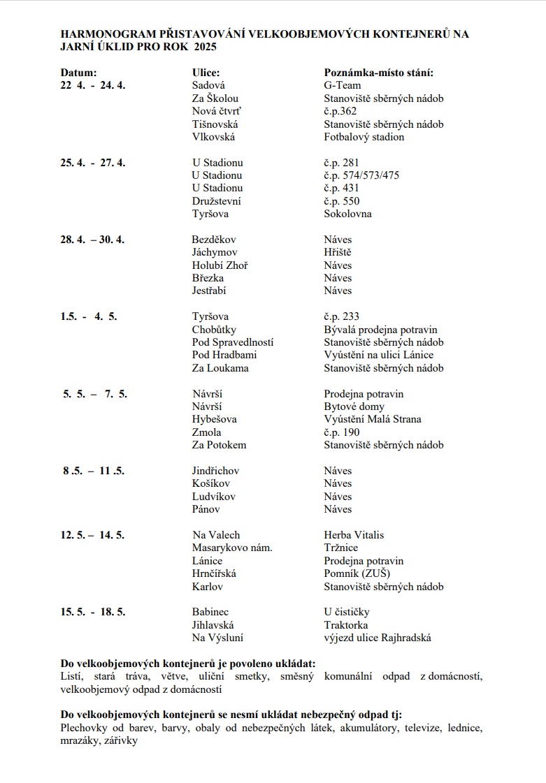 HARMONOGRAM PŘISTAVOVÁNÍ VELKOOBJEMOVÝCH KONTEJNERŮ 15.4.2025 Přinášíme Vám harmonogram přistavování velkoobjemových kontejnerů na jarní úklid pro rok 2025.
