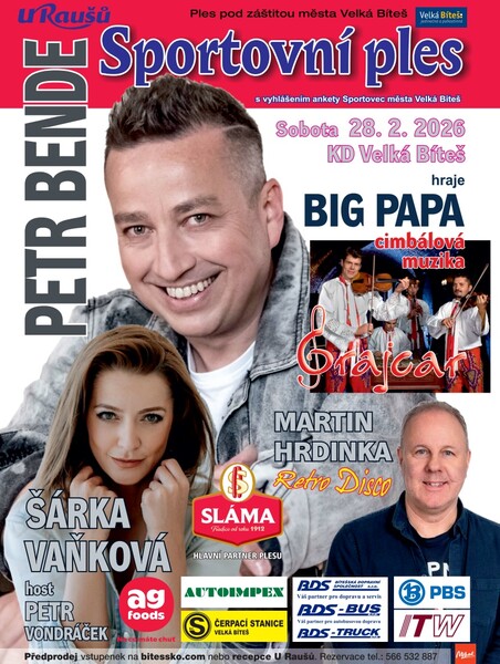 Sportovní ples s vyhlášením ankety Sportovec města Velká Bíteš se uskuteční 28. února 2026 v Kulturním domě ve Velké Bíteši. Hraje Big Papa a cimbálová muzika Grajcar.