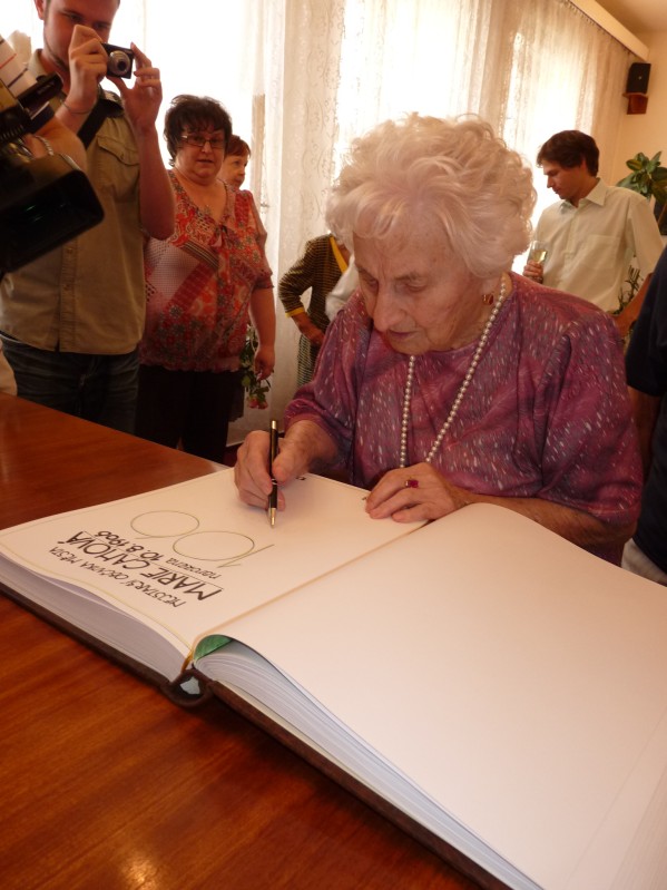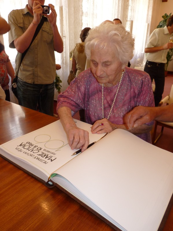 Paní Cahová všem za přání a nejen květinové dary poděkovala. Připila si slavnostním přípitkem a podepsala se do pamětní knihy a to nutno říci - bez brýlí! Po podepsání poskytla malý rozhovor a odpověděla na pár otázek do TV Nova. Dle slov svého syna má paní Cahová krásný a šťastný život.