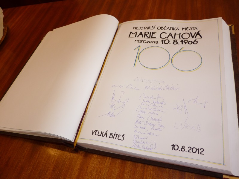 V pátek 10. srpna 2012 v 10 hodin na Radnici v obřadní síni se uskutečnila oslava 106. narozenin paní Marie Cahové, občanky Velké Bíteše, které patří titul nejstarší občanka Velké Bíteše a Kraje Vysočina. Tato velice vitální paní na svoji oslavu vyšla schody do prvního patra sama s hůlkou, a když vešla do dveří obřadní síně v doprovodu svých synů – 106 let by jí hádal málokdo. Potvrzují to i slova MUDR. Svatopluka Horka, který paní Cahové řekl: „do schodů jsem Vám nestačil, jak jste utíkala".