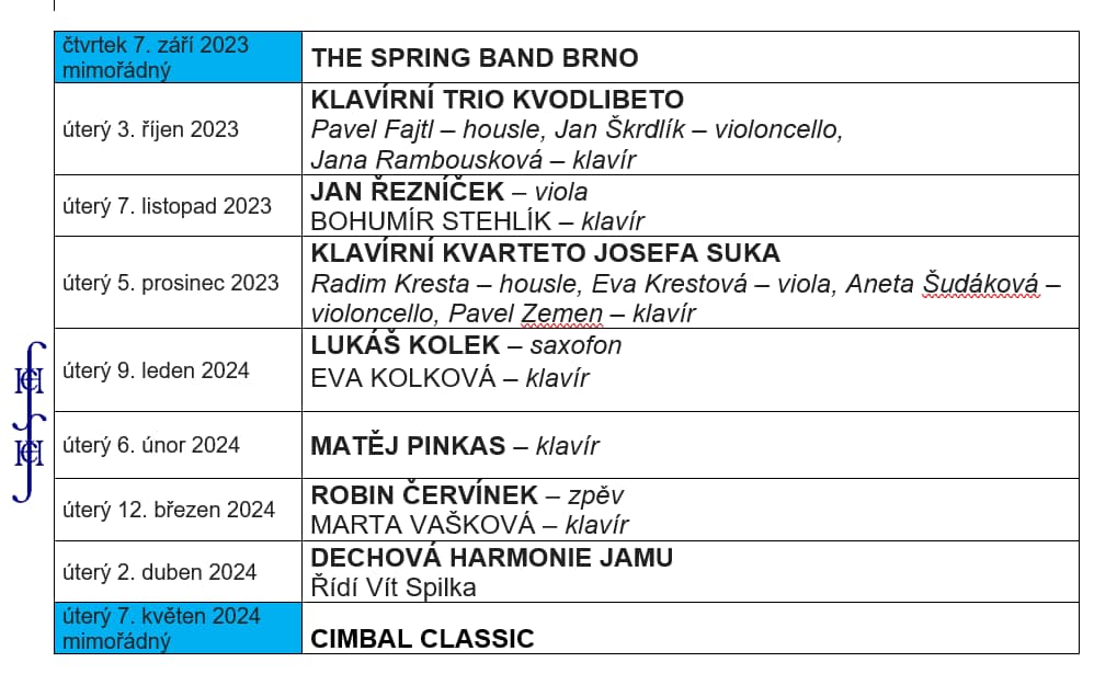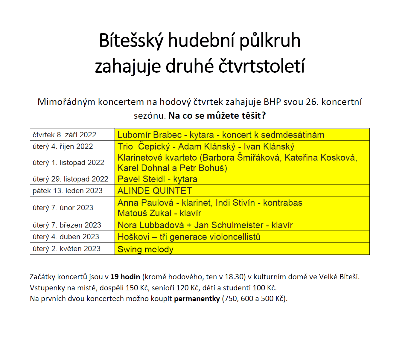 Začátky řádných koncertů jsou vždy v 19 hodin v Kulturním domě ve Velké Bíteši, Vlkovská 482.