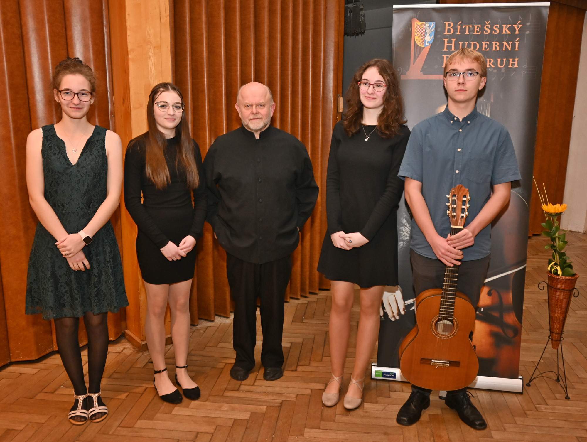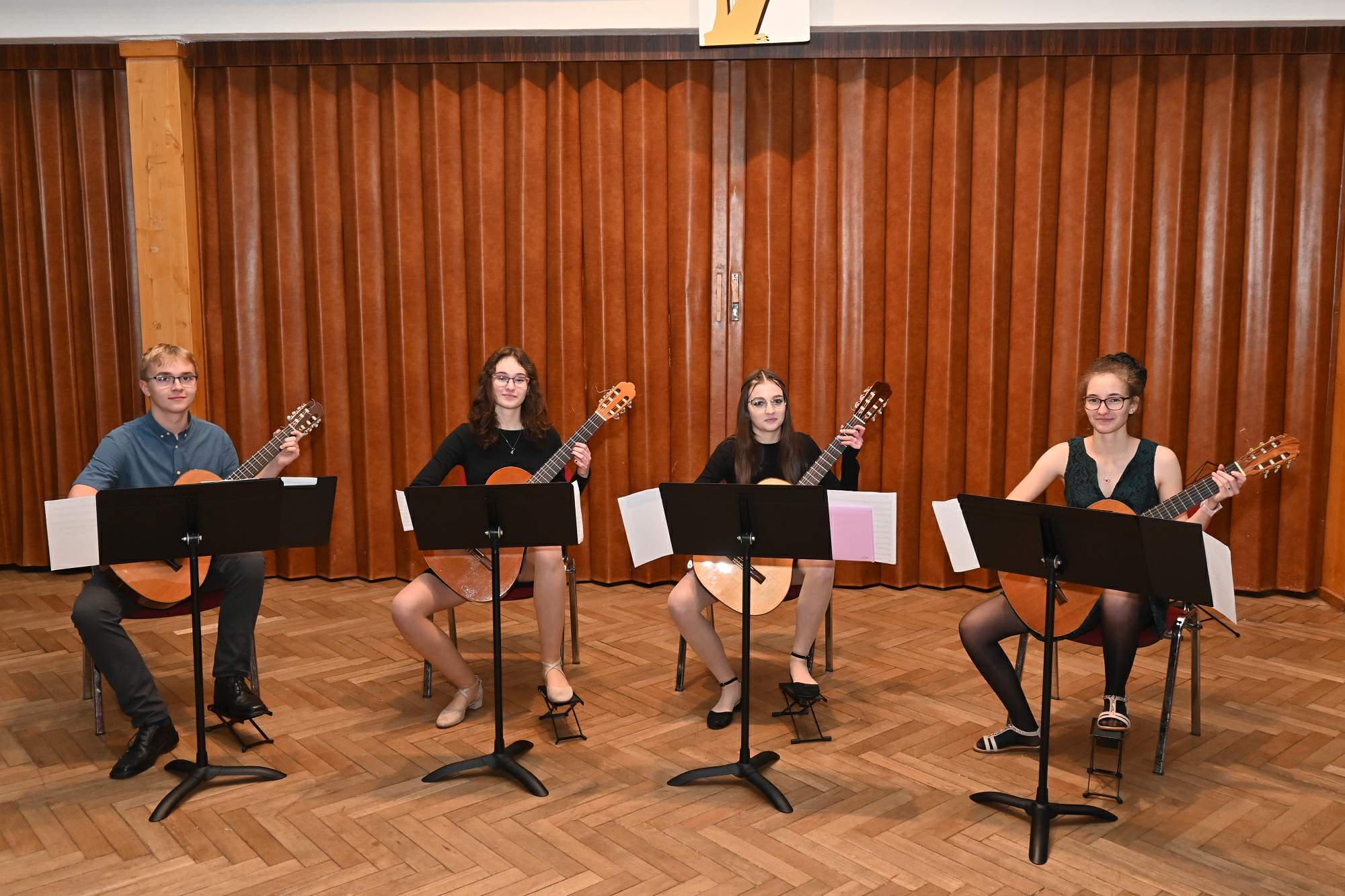 Na úvod koncertu vystoupilo kytarové kvarteto ZUŠ ve složení Nikola Dohnalová, Natálie Doubková, Hana Ráčková a Patrik Klega. Provedli hezkou úpravu skladby Bohemian Rhapsody Freddie Mercuryho. Tuto poměrně náročnou skladbu jsme spolu od září nacvičovali a myslím, že ji moc pěkně zahráli a celkově odvedli kus práce. I Pavel Steidl kvarteto pochválil a zajímal se, co je to úpravu.