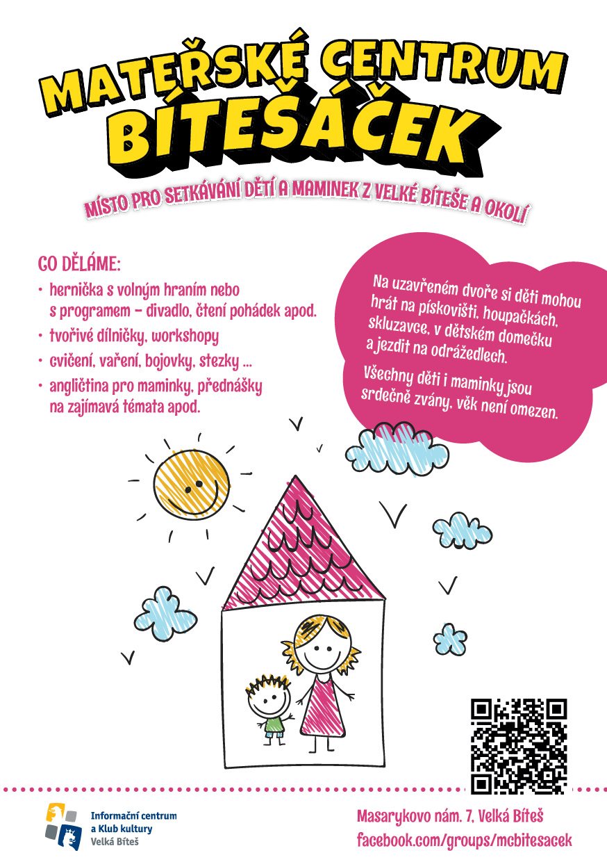 Mateřské centrum Bítešáček sdružuje maminky s dětmi na rodičovské dovolené z Velké Bíteše či okolí, přičemž věk není omezen. Malí návštěvníci si v centru pod dozorem svých maminek společně hrají, malují nebo nebo cvičí, a tak vytváří kolektiv, který je pro děti přirozený a tudíž důležitý.