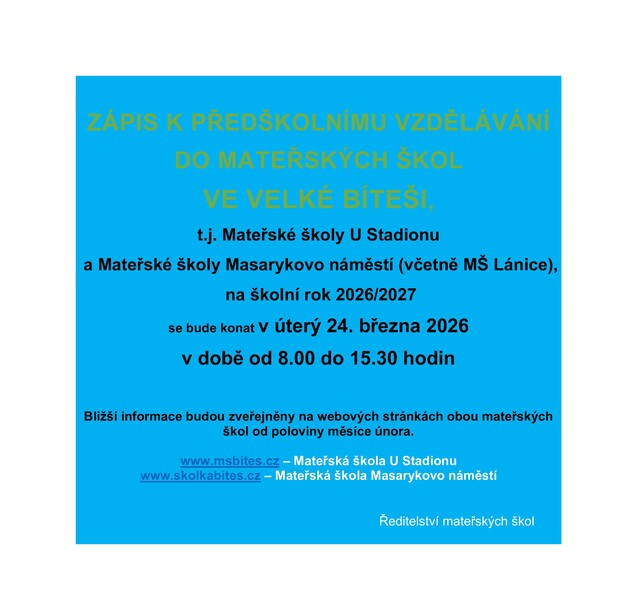 Zápis k předškolnímu vzdělávání do mateřských škol ve Velké Bíteši se bude konat v úterý 24.3.2026 v době od 8.00 - 15.30 hodin.
