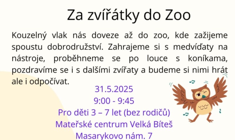 Mateřské centrum Velká Bíteš zve všechny děti od 3 do 7 let na společné zpívání a tančení s lektorkou Ester Pochopovou, které se uskuteční 31. května 2025 v MC na Masarykově náměstí 7.