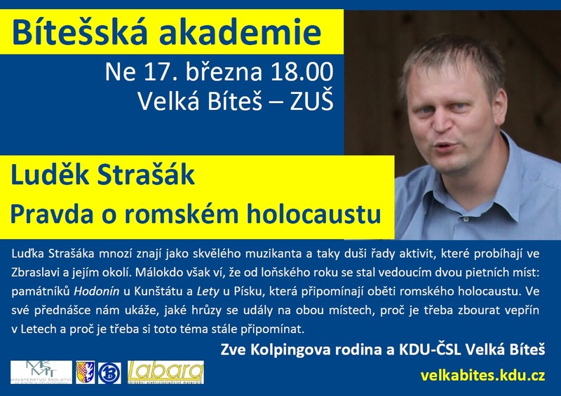 Kolpingova rodina a KDU-ČSL Vás zvou na BÍTEŠSKOU AKADEMII s Luďkem Strašákem na téma Pravda o romském holocaustu, aneb proč je třeba zbourat vepřín v Letech a proč je třeba si toto téma stále připomínat.