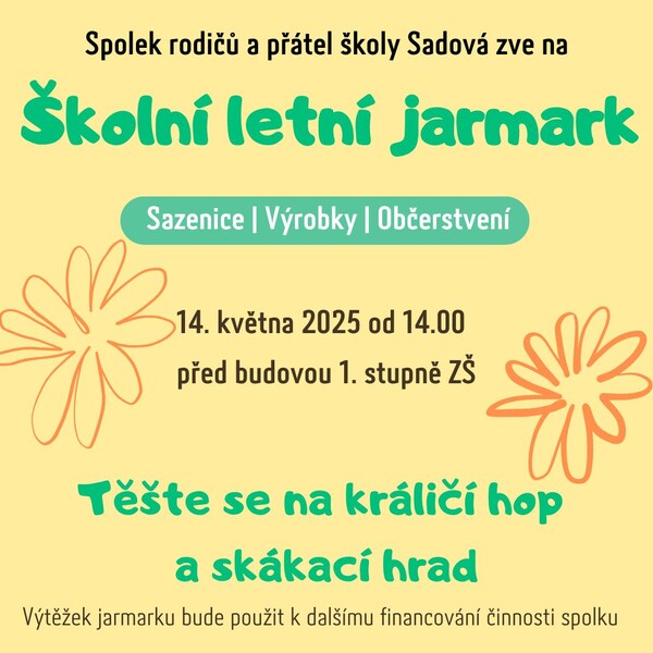 Spolek rodičů a přátel školy ZŠ Sadová Vás srdečně zve na ŠKOLNÍ LETNÍ JARMARK, který se uskuteční 14. května 2025 od 14 hodin před budovou 1. stupně ZŠ.