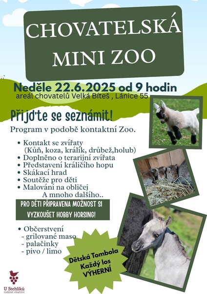 Zveme Vás na chovatelskou mini zoo do areálu chovatelů ve Velké Bíteši. Děti se můžou těšit na kontakt se zvířaty (kůň, koza, králík, drůbež, holub), králičí hop, skákací hrad, malování na obličej aj.