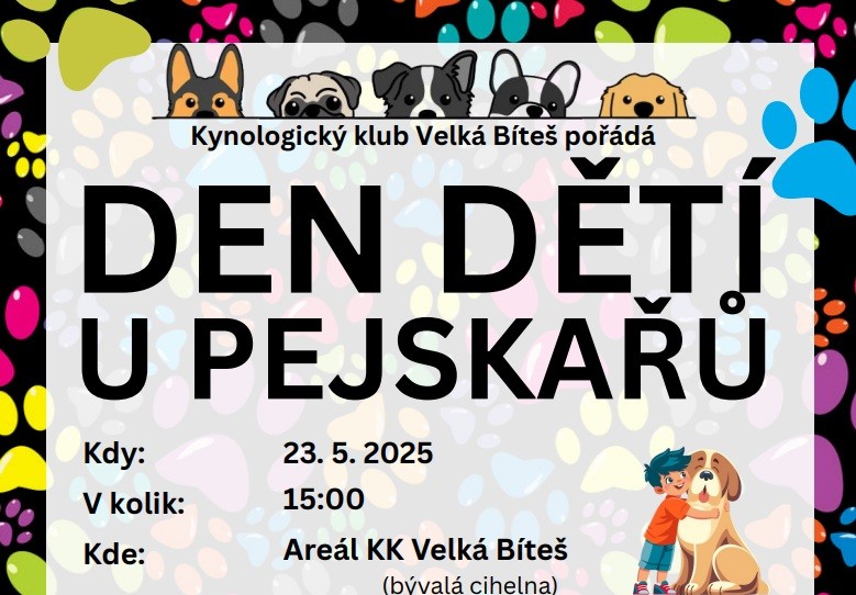 Kynologický klub Velká Bíteš pořádá dětský den u pejskařů, který se uskuteční 23. května 2025 od 15 hodin v areálu bývalé cihelny.
