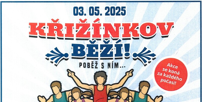 Zveme Vás na sportovní akci - KŘIŽÍNKOV BĚŽÍ, která je určena pro všechny sportovní nadšence. Tato akce se uskuteční 3. 5. 2025 v obci Křižínkov. Je určena pro všechny věkové kategorie. Děti se můžou těšit na kouzelníka, skákací hrad, malování na obličej aj.