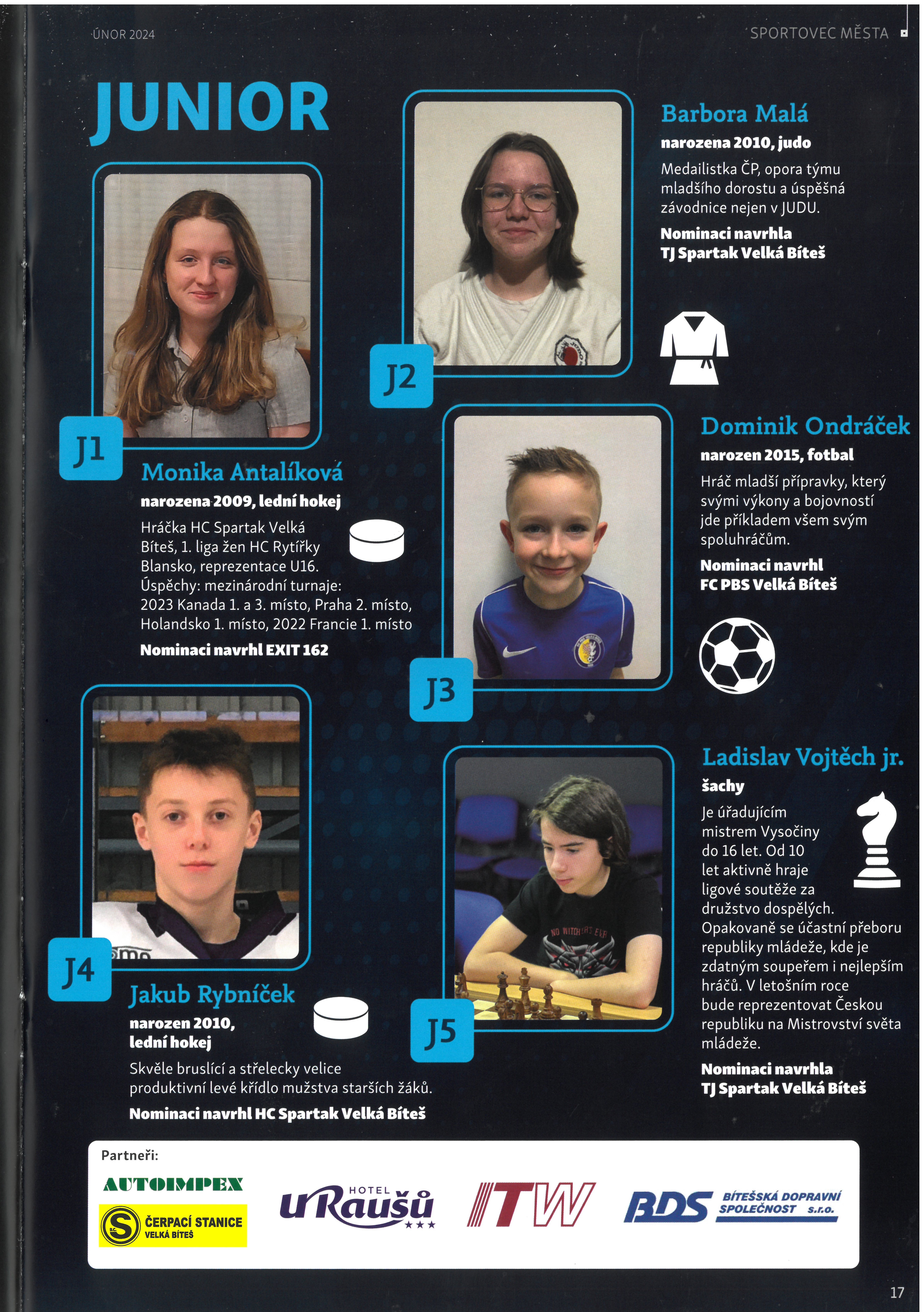 Představujeme vám 17. ročník ankety o nejlepšího sportovce, juniora, mužstvo a trenéra Velké Bíteše SPORTOVEC MĚSTA 2023.