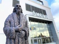 Výjimečná bronzová socha Jana Ámose Komenského v nadživotní velikosti, umístěna před hlavním vchodem do budovy prvního stupně základní školy, je dílem moravského sochaře a malíře Nikose Armutidise. (vytvořil např. bustu V. Menšíka na ZŠ v Ivančicích) a nese tento nápis: