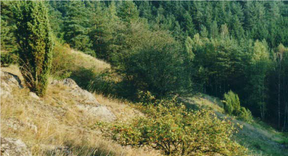 přírodní památka_PláněBývalé pastviny s porostem jalovce obecného a dalších teplomilných druhů rostlin (například hvozdík kropenatý nebo vzácný devaterník velkokvětý).