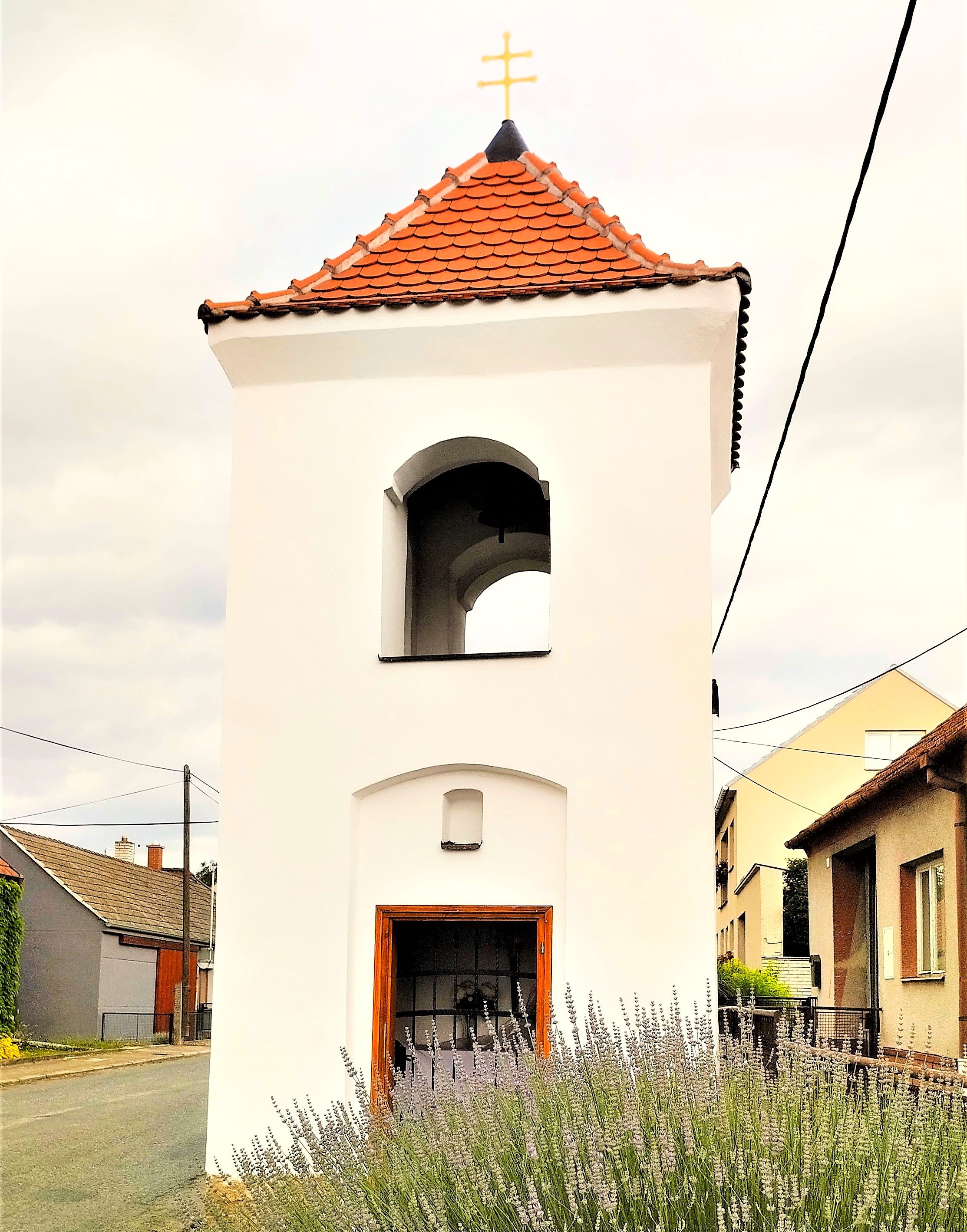 Když budete projíždět nebo procházet obcí po hlavní silnici dále, narazíte na opravenou bílou zvoničku se zlatým tzv. cyrilometodějským (dvojramenným) křížkem nahoře.