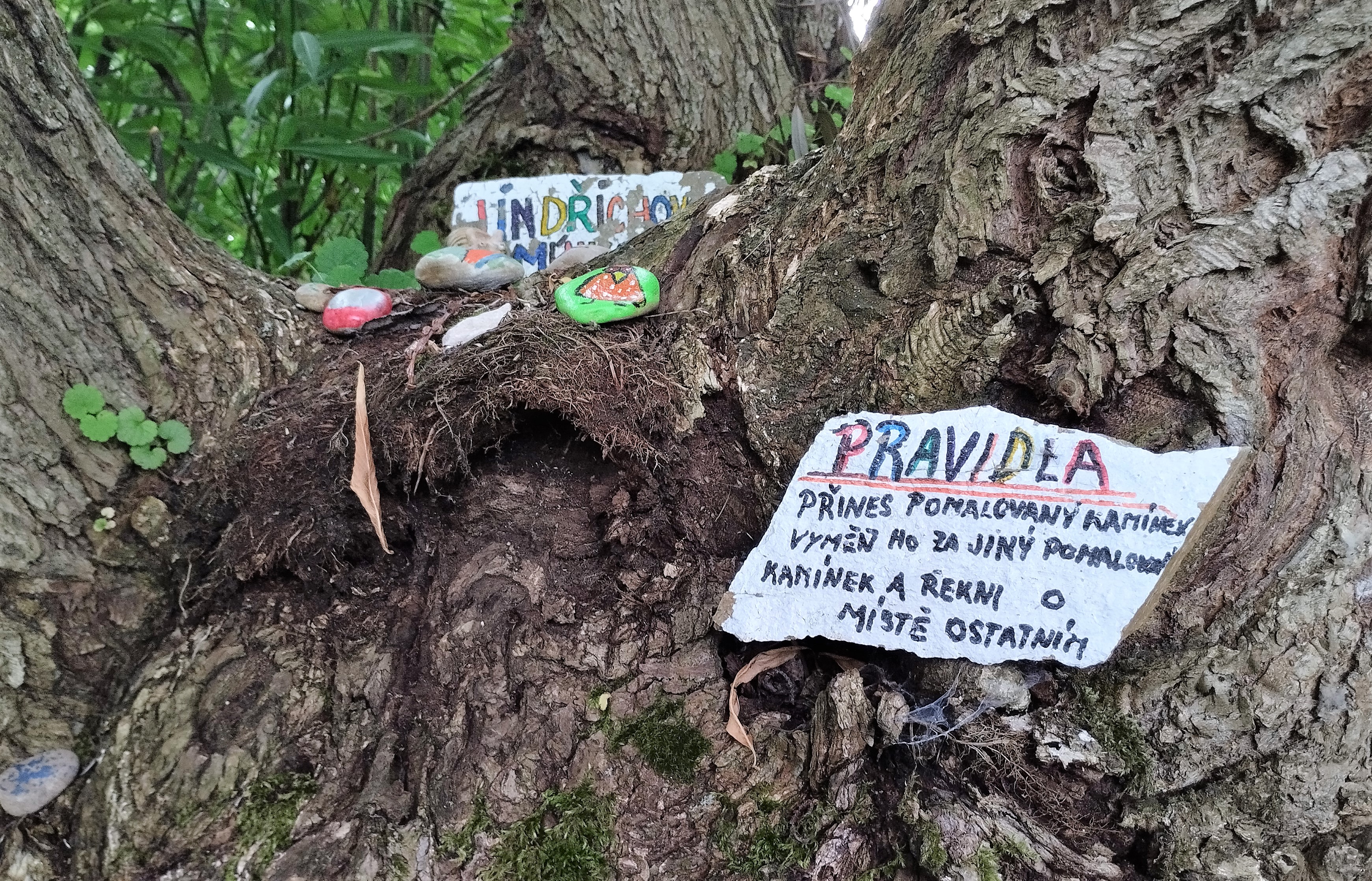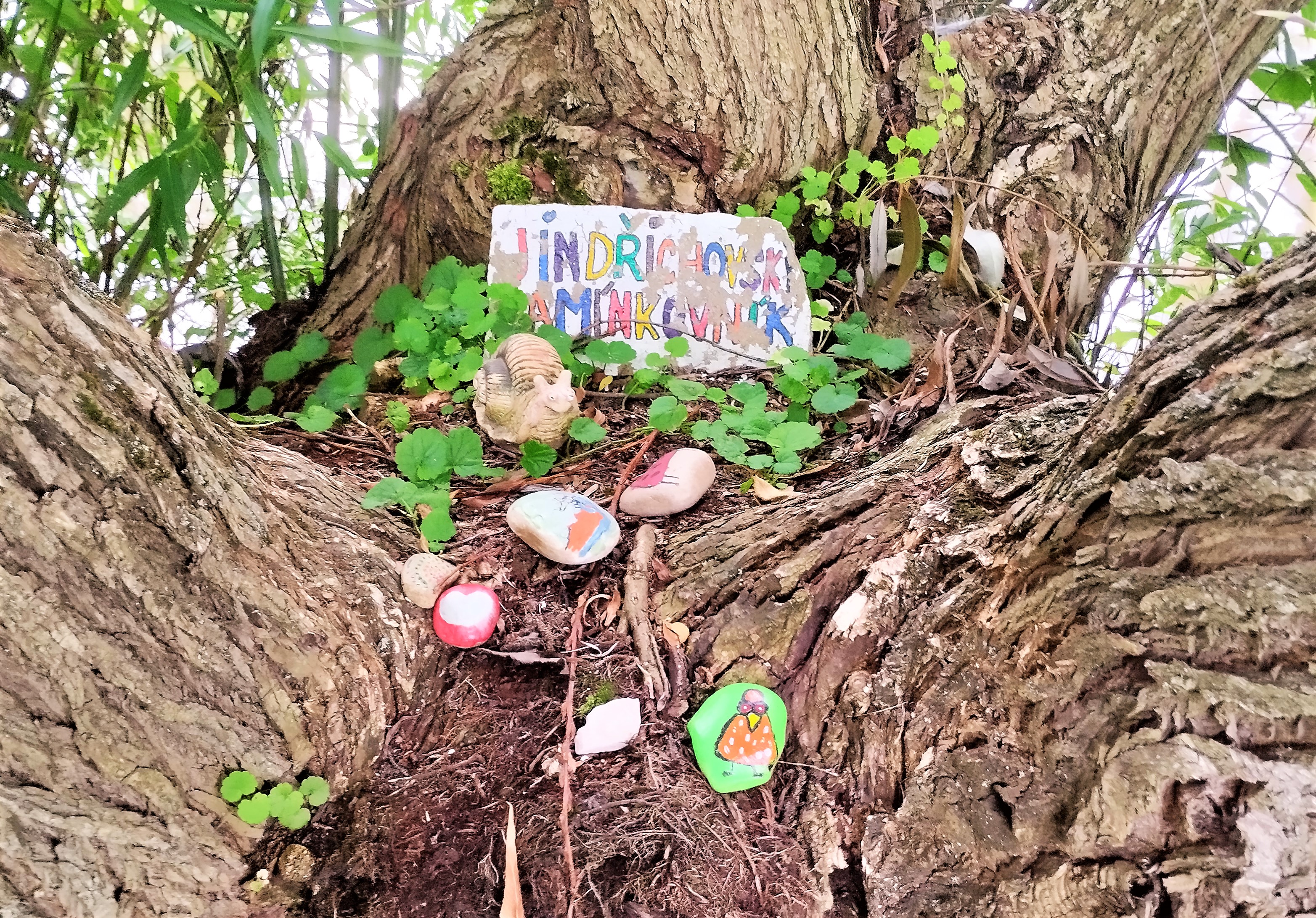 Při cestě kolem rybníčku nechejte děti objevit „poklad" – JINDŘICHOVSKÝ KAMÍNKOVNÍK na stromě u vody. Je plný barevných kamínků k výměně.