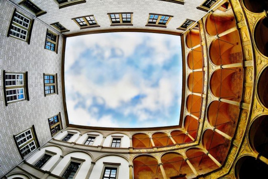 Hned na nádvoří mohou návštěvníci obdivovat renesanční arkády s alegorickými reliéfy. Areál je tvořen vlastním zámkem, dvěma křídly předzámčí, dvěma nádvořími a krásnou zámeckou zahradou