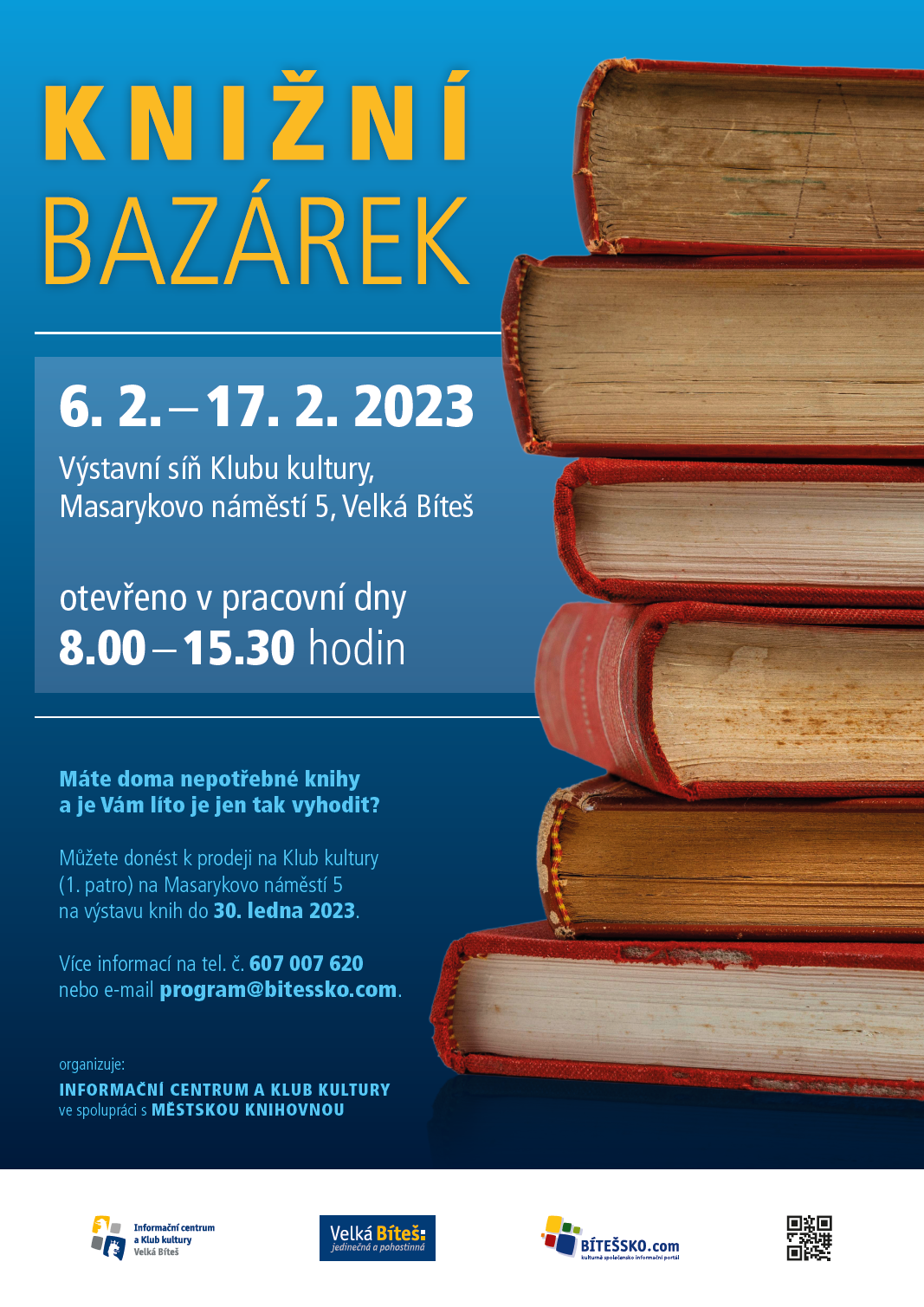 Máte doma nepotřebné knihy a je vám líto je jen tak vyhodit? Můžete donést k prodeji na Klub kultury (1. patro) na Masarykovo náměstí 5 na výstavu knih do 30. ledna.