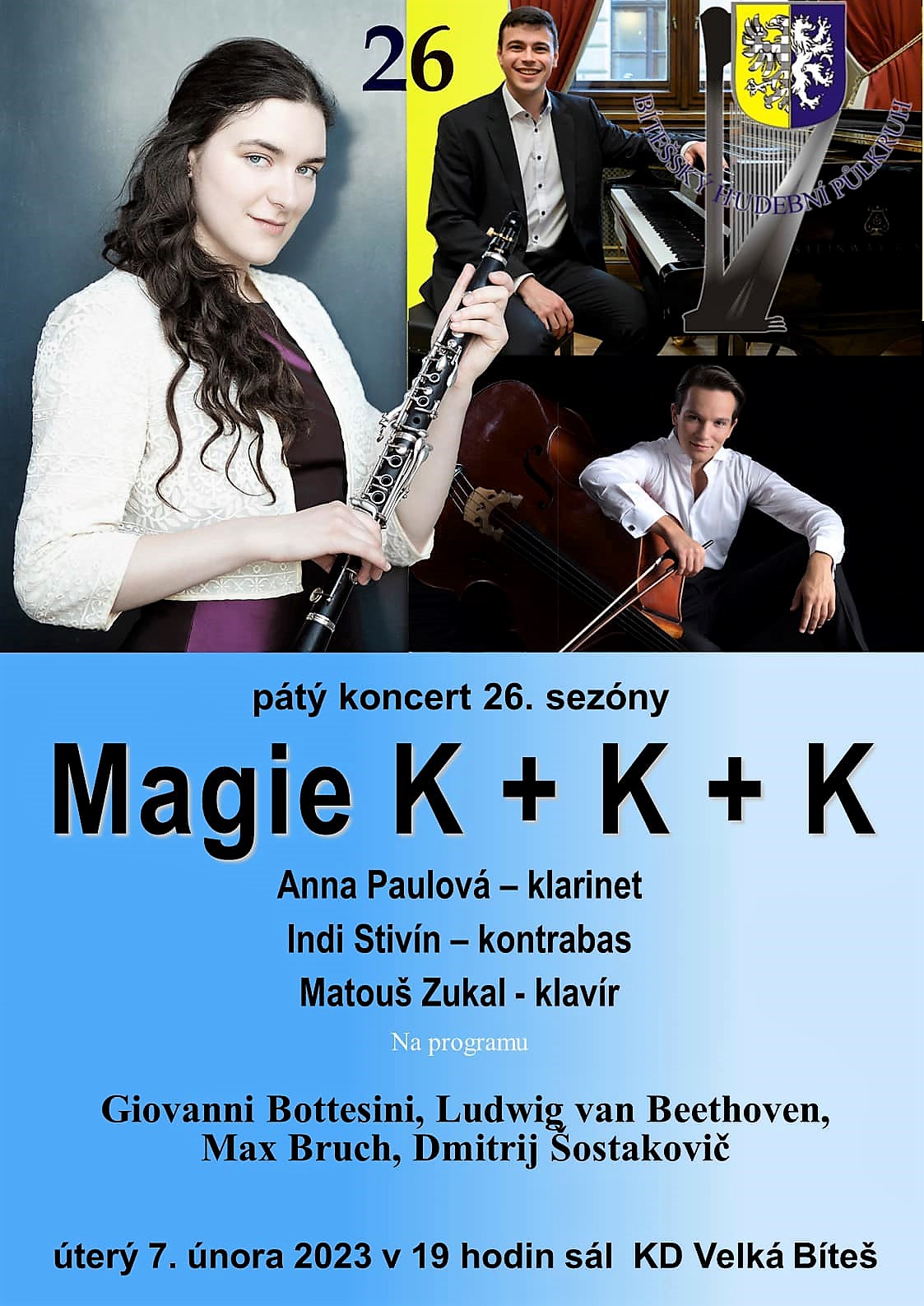 Tentokráte si BHP připravil lehce netradiční trio – klarinet, kontrabas a klavír. Hrát bude Anna Paulová na klarinet, Indi Stivín na kontrabas a Matouš Zukal na klavír.