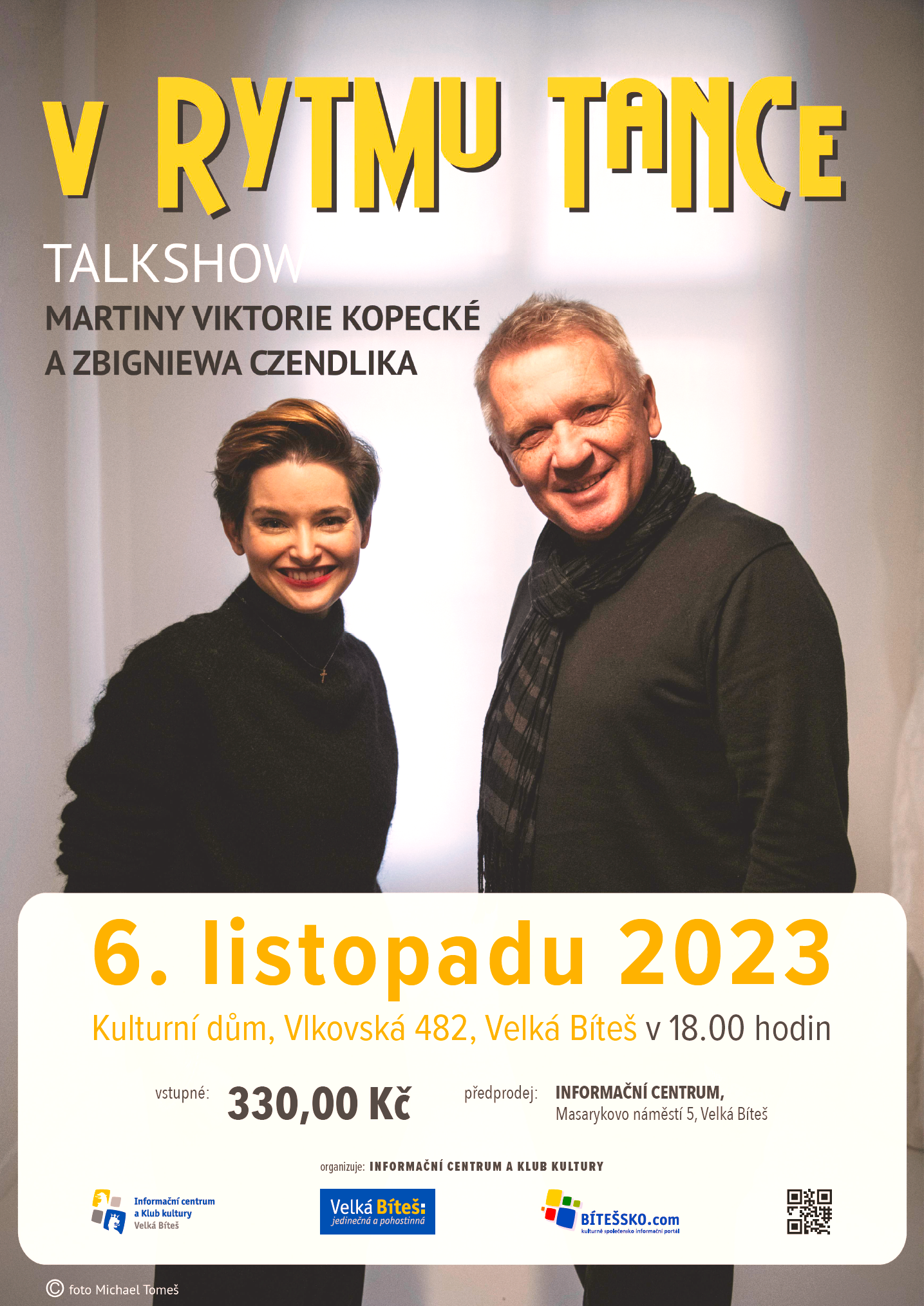 Předprodej vstupenek v Informačním centru ve Velké Bíteši, Masarykovo nám. 5 nebo online zde: https://www.bitessko.com/mistenky/v-rytmu-tance-talkshow